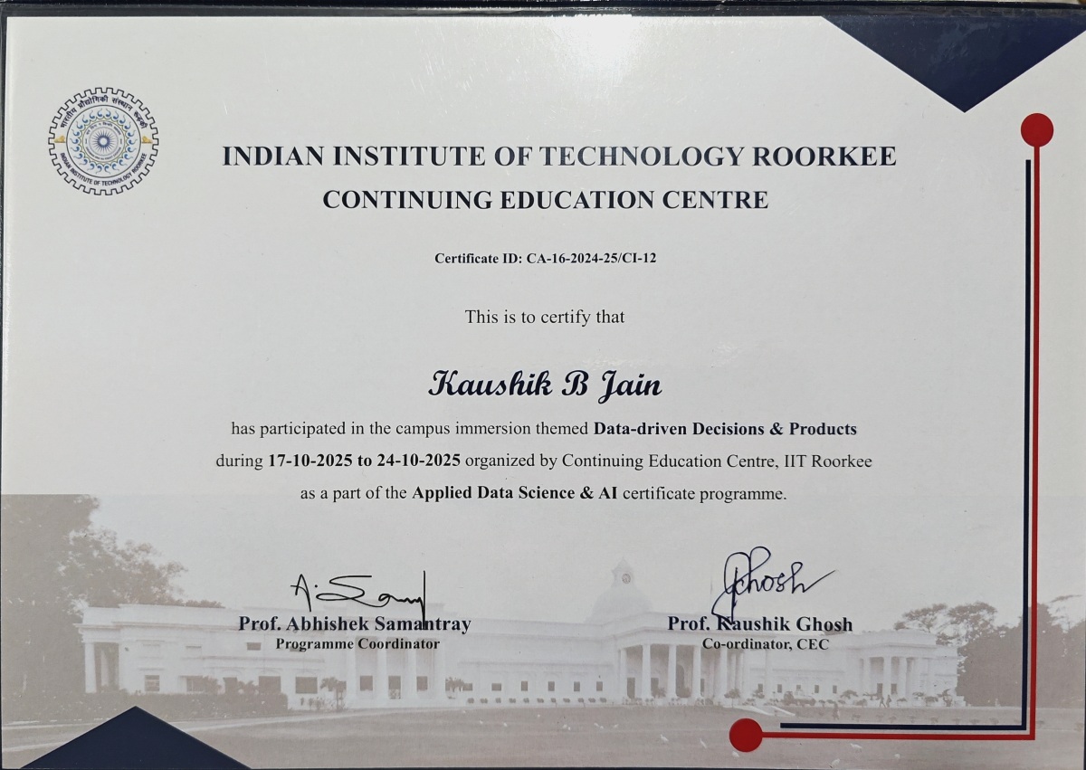 I'm Kaushik Jain, my core-print is a deep-seated analytical curiosity. I am driven to understand the "why" behind everycomplex systems. I believe that the most powerful solutions are born from an uncluttered mind and driven by an innate need to not just deconstruct complexity but to connect the dots. I bring that same "connect-the-dots" mindset to my work, allowing me to cut through ambiguity and identify the most effective logical path to a solution.